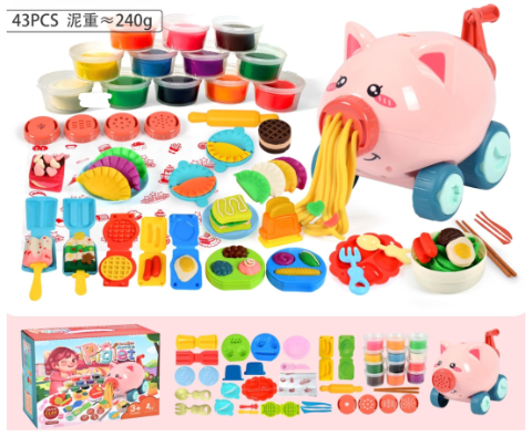 Acest set colorat cu porcușor aduce distracția la un alt nivel – modelul economic, fără baterii și fără mecanisme electrice, unde totul se face manual: copiii rotesc mânerul și creează plastilină delicioasă, într-o joacă creativă și plină de râsete