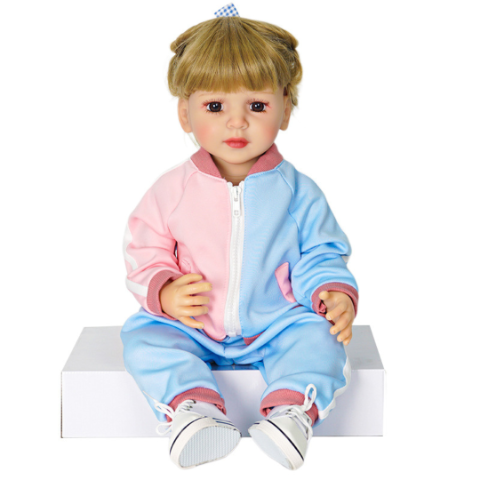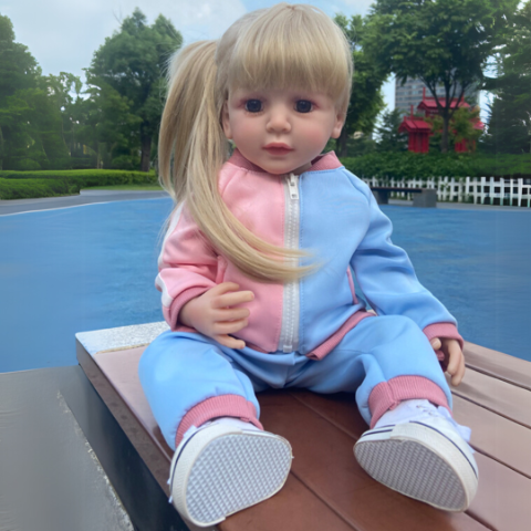Îmbrăcată într-un trening roz-albastru cu detalii fine, păpușa este pregătită pentru aventuri urbane sau ore de joacă în parc.