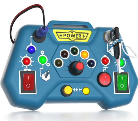 Această consolă interactivă tip Busy Board atrage instant curiozitatea celor mici cu designul său colorat și realist inspirat din controlerele de joc.