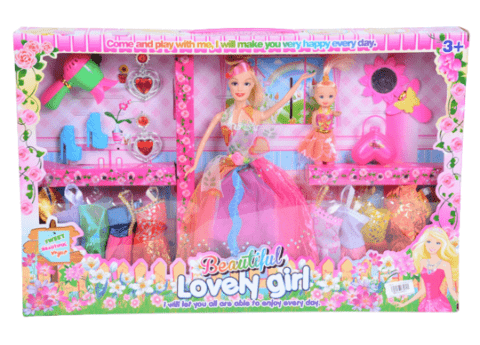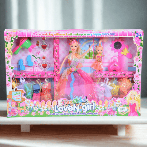 Această păpușă elegantă îmbrăcată în rochie de bal este însoțită de o micuță prietenă, pregătită pentru joacă de rol.