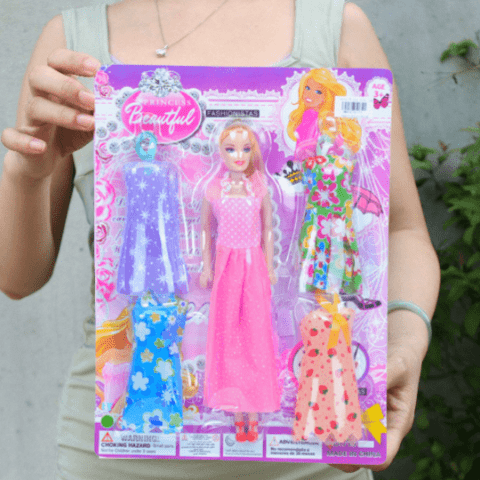 Pe partea dreaptă, păpușa poate fi transformată într-o fashionistă de vară cu rochii florale și imprimeuri de căpșuni.