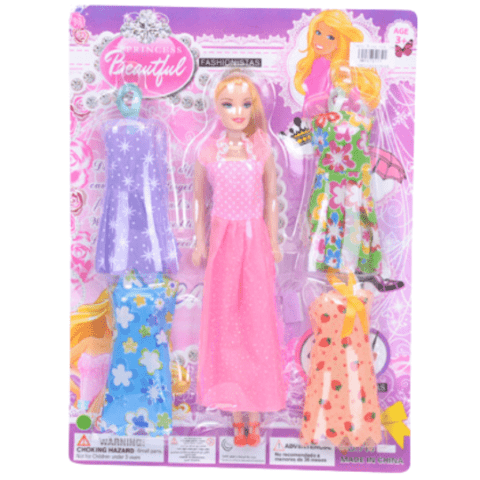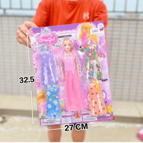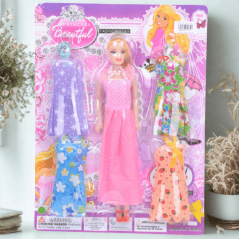 Această păpușă elegantă vine îmbrăcată într-o rochie roz cu buline, perfectă pentru o petrecere imaginară.
