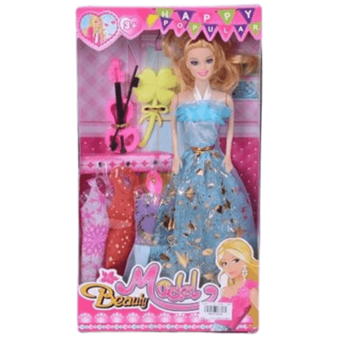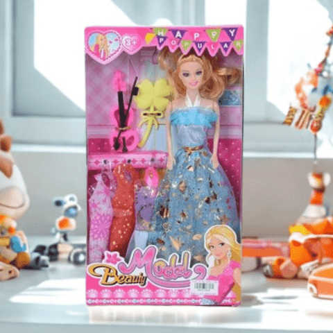 Păpușa Beauty de 33 cm strălucește într-o rochie albastră cu detalii aurii, pregătită pentru povești pline de stil.