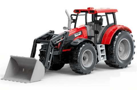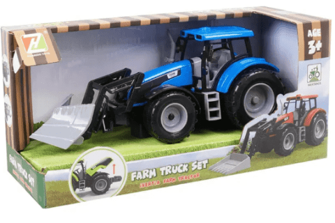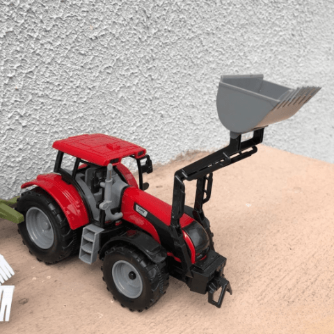 Modelul este disponibil în culori vibrante, roșu și albastru, oferind copiilor posibilitatea de a alege tractorul preferat.