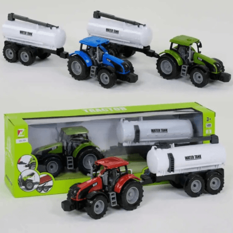 Setul include tractoare colorate, fiecare dotat cu o cisternă detașabilă pentru transportul apei, aducând realism în joaca copiilor.