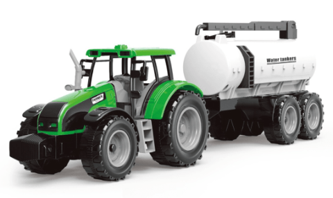 Tractorul verde cu cisternă albă imită perfect utilajele agricole, oferind copiilor ocazia de a învăța prin joc despre munca la fermă.
