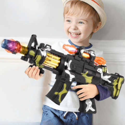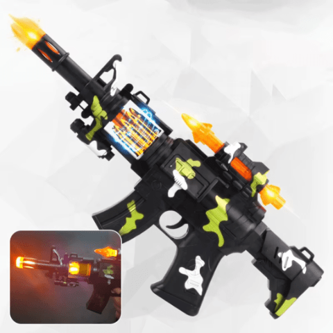 Mitraliera de jucărie are un design realist de camuflaj și tambur rotativ cu cartușe aurii care luminează spectaculos.
