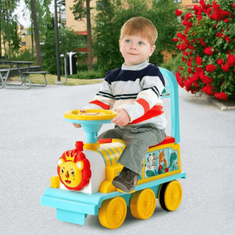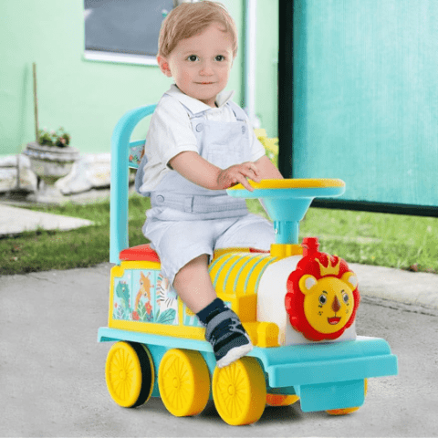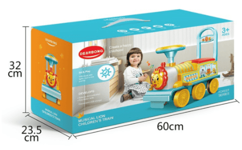 Trenulețul vesel cu față de leu aduce copiilor bucurie și aventuri pline de energie.