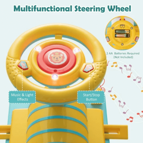 Volanul multifuncțional oferă efecte muzicale și lumini care transformă joaca într-o experiență interactivă.