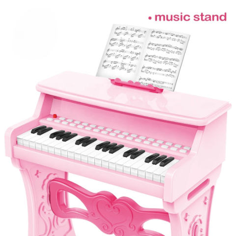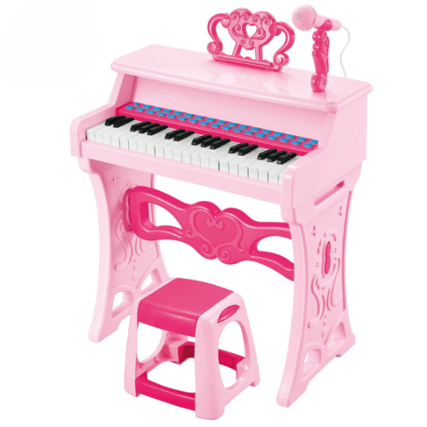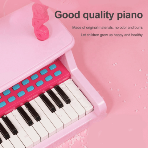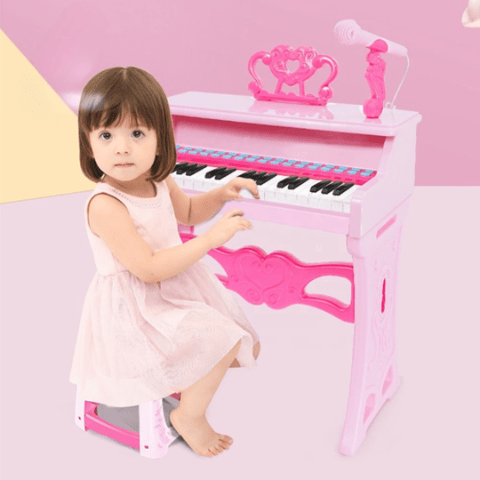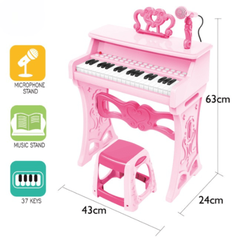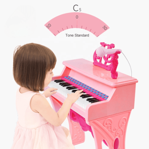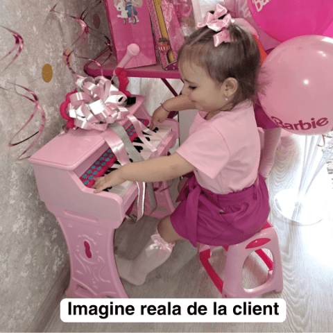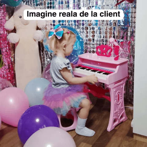 Pianul electronic roz transformă orice moment într-un spectacol muzical plin de culoare și imaginație.