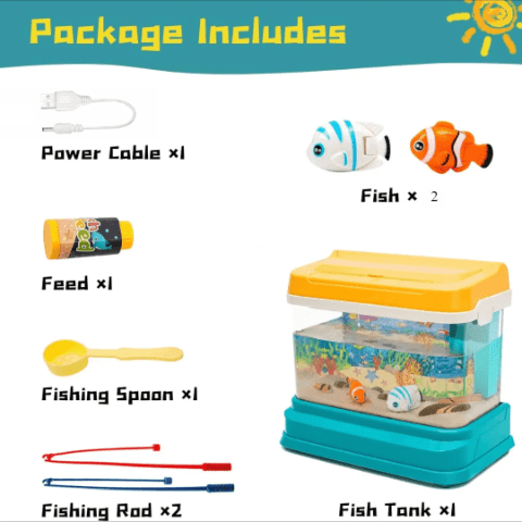 Setul include acvariu, doi pești, două undițe, hrănitoare, cablu USB și linguriță de pescuit.