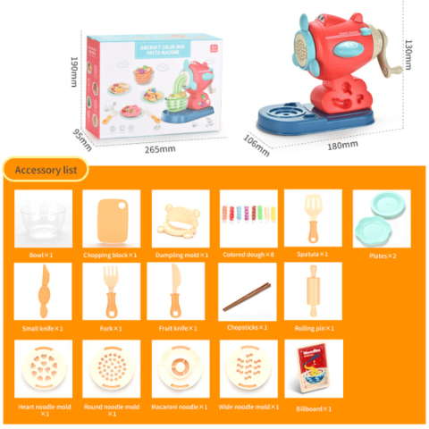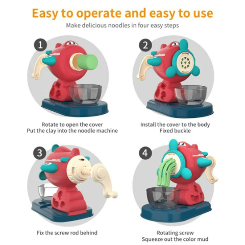 Procesul este simplu: adaugi plastilina, rotești manivela și obții pastele dorite.