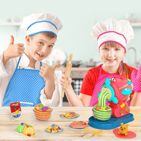 Copiii pot folosi plastilina pentru a crea spaghete, tăiței și paste colorate.