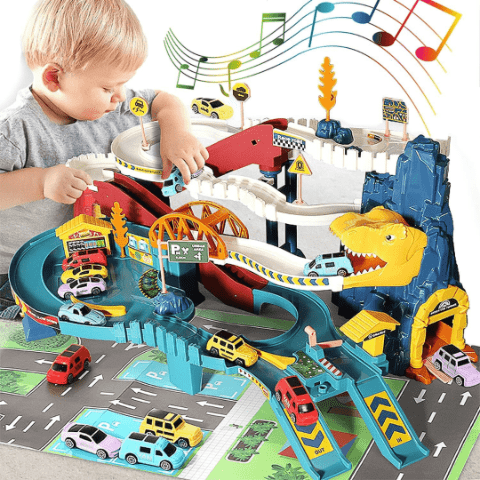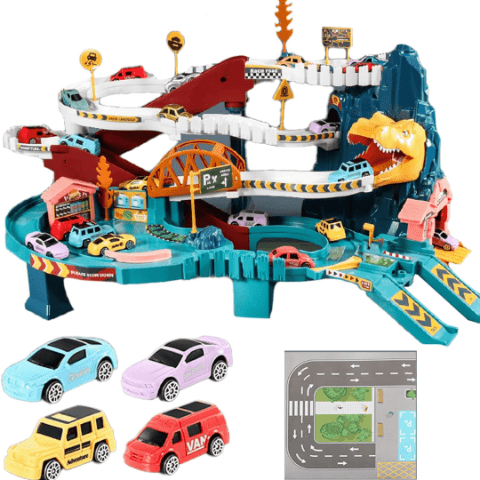 Pista de curse cu tematică dinozaur îi invită pe copii într-o aventură plină de adrenalină, cu rampe abrupte și curbe spectaculoase.