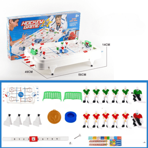 Setul include echipe complete în culori diferite, portari, pucuri și mecanism de numărare a scorului, pentru un joc realist și competitiv.