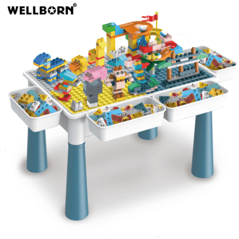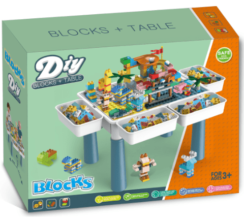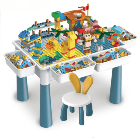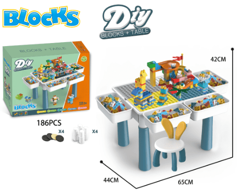 Masa de construcție vine echipată cu 186 de piese colorate care stimulează imaginația și dezvoltarea creativității copiilor.