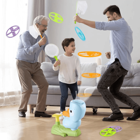 Jocul devine mai palpitant când întreaga familie folosește plasele pentru a prinde discurile în aer.
