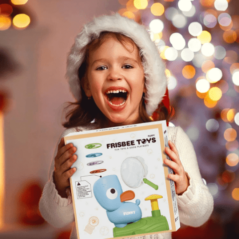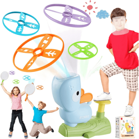 Setul include un cățel lansator vesel care aruncă discuri zburătoare atunci când copilul apasă pedala.