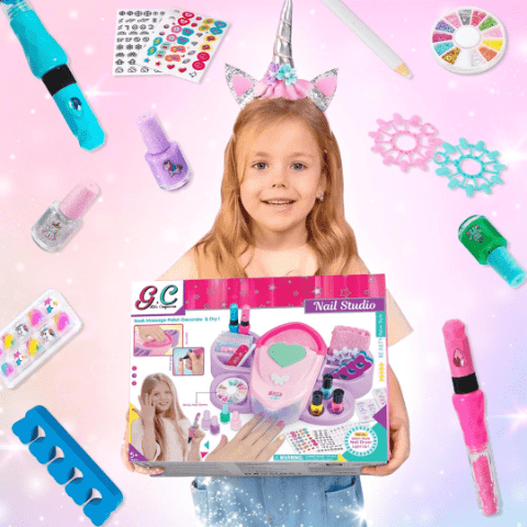 Fetițele pot exersa creativitatea prin aplicarea glitterului, stickerelor și a decorațiunilor strălucitoare pe unghii.