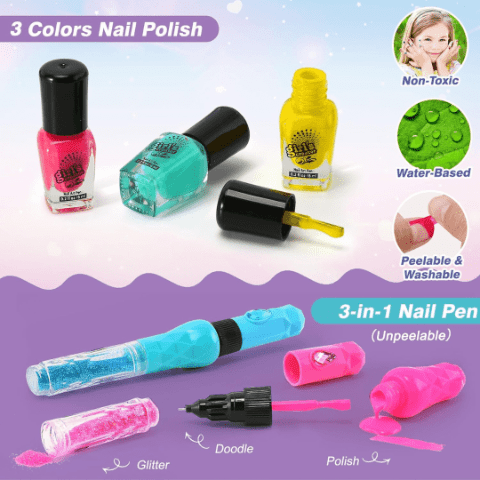 Pixurile multifuncționale 3-în-1 adaugă distracție prin posibilitatea de a desena, aplica glitter sau lac de unghii.