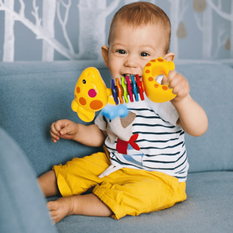 Plasticul rezistent, dar neted la atingere, garantează siguranța în timpul jocului și protejează gingiile bebelușului.