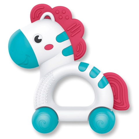 Calul alb cu roți albastre și coamă roșie este o jucărie mobilă care încurajează mișcarea și coordonarea.