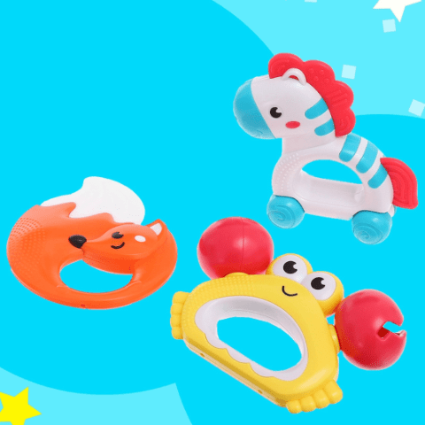 Setul conține trei zornăitori colorate – cal, vulpiță și crab – fiecare cu design atractiv și prietenos pentru bebeluși.