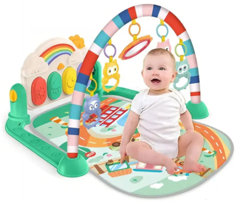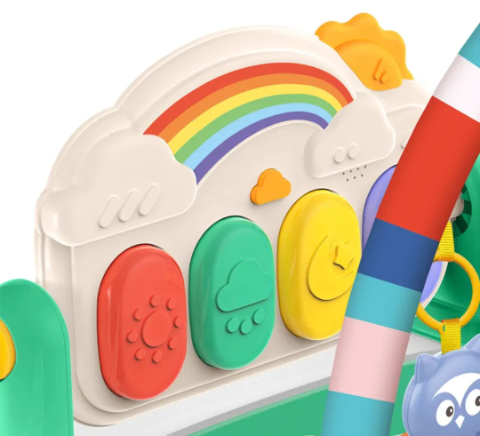 Pianul integrat cu butoane colorate și sunete muzicale adaugă o dimensiune educativă, ajutând bebelușul să exploreze sunetele și culorile.