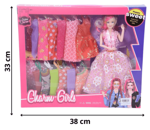 Setul Charm Girls include o păpușă elegantă și o colecție variată de rochițe colorate pentru joaca de rol.