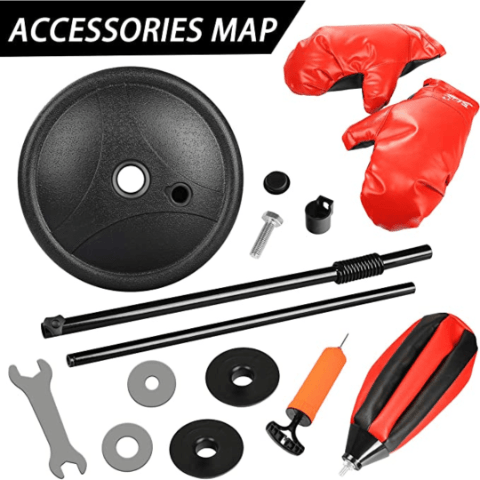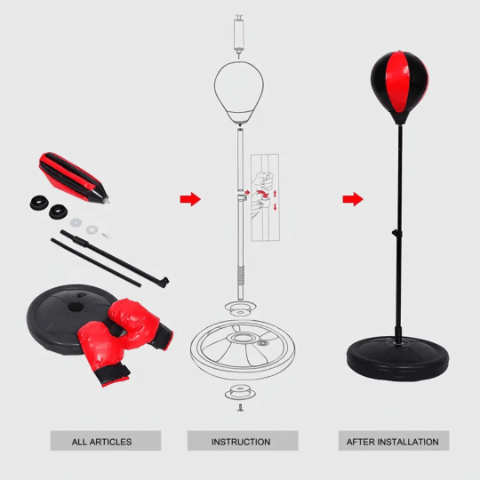 Setul conține mănuși de box pentru copii, mingea de box, suportul reglabil și baza stabilă.
