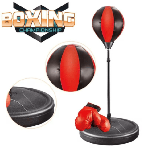 Setul de box pentru copii include o minge de antrenament pe stativ, perfectă pentru exerciții de coordonare și distracție.