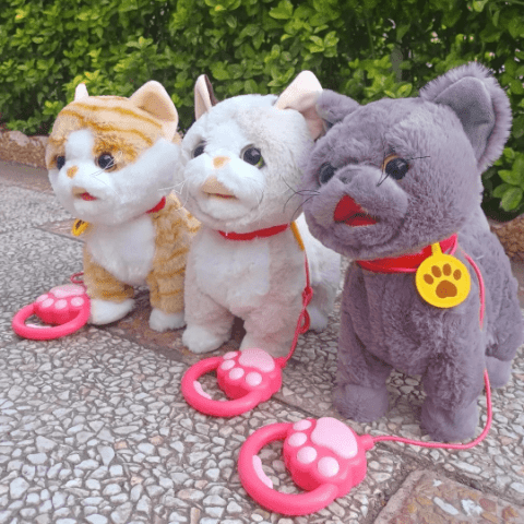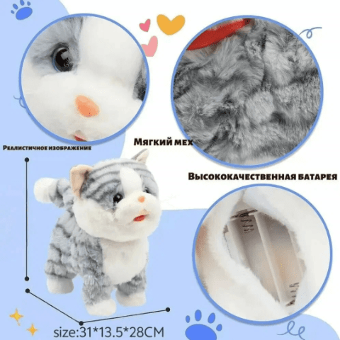 Pisicuța merge, dă din coadă, dă din cap și chiar scoate limbuța, imitând gesturile unui animal adevărat.