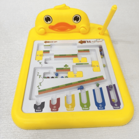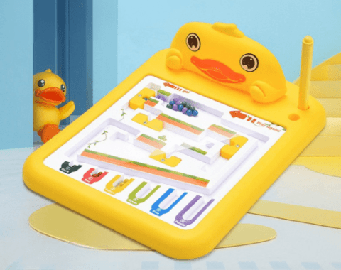 Tabla de joc are design vesel cu rață galbenă și include bile colorate care trebuie ghidate prin labirint.