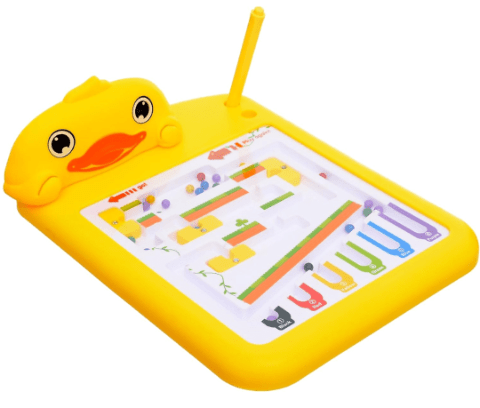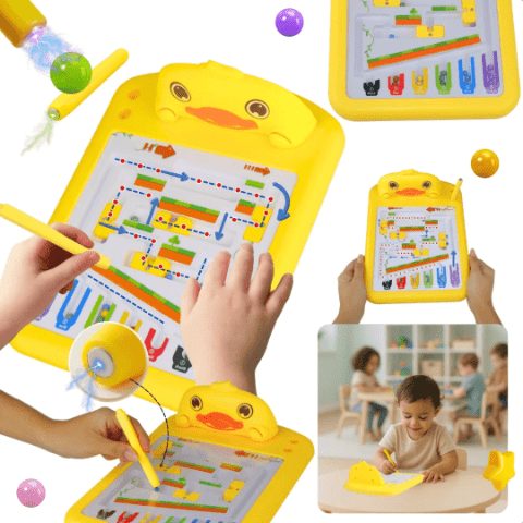 Copiii folosesc un stilou magnetic pentru a muta bilele prin traseu, dezvoltând coordonarea mână-ochi.