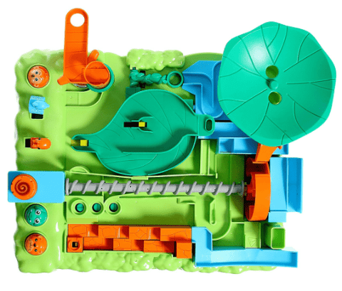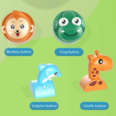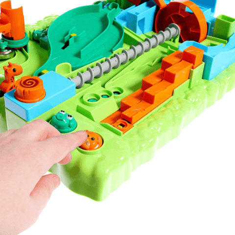 Fiecare buton în formă de animal activează un mecanism diferit – maimuța, broasca, delfinul sau girafa dau startul unei noi mișcări pentru bile.