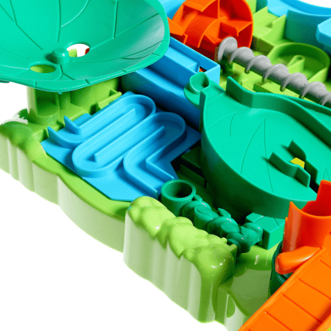 Setul „Jungle Adventure” aduce un joc plin de provocări unde copiii trebuie să ghideze bilele metalice printr-un traseu spectaculos.
