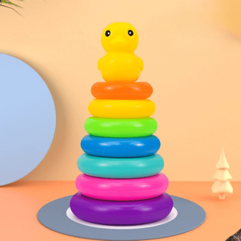 Copilul se bucură să descopere culorile vii și să pună inelele unul peste altul, dezvoltând abilități motorii fine.