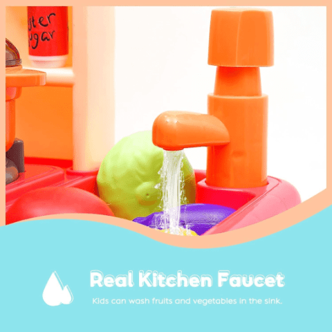 Chiuveta funcțională permite circularea apei reale, astfel încât copiii să spele fructele și legumele din set.