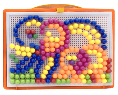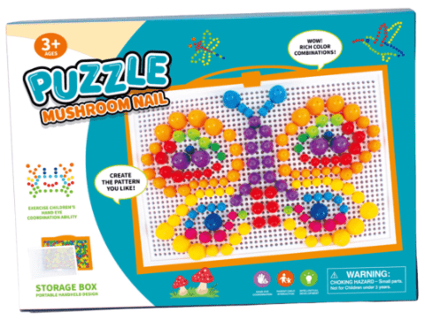 Acest puzzle mozaic colorat conține o planșă perforată și zeci de ciupercuțe viu colorate, toate de aceeași mărime, realizate din plastic rezistent și sigur pentru copii.