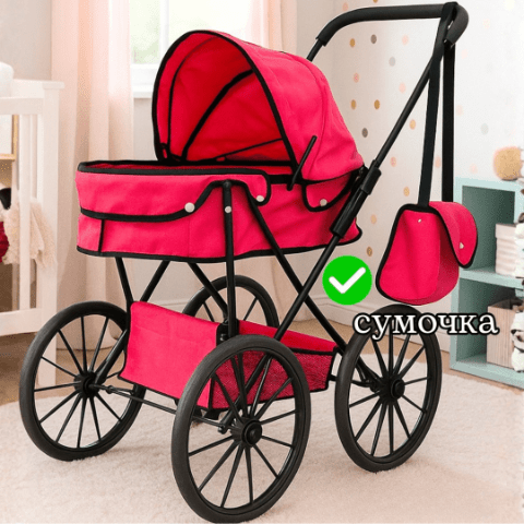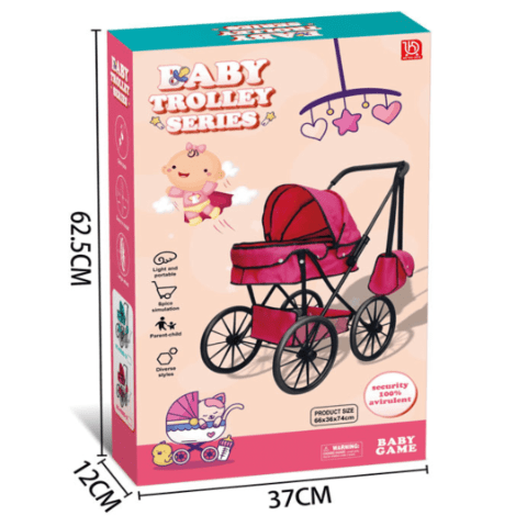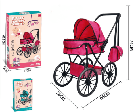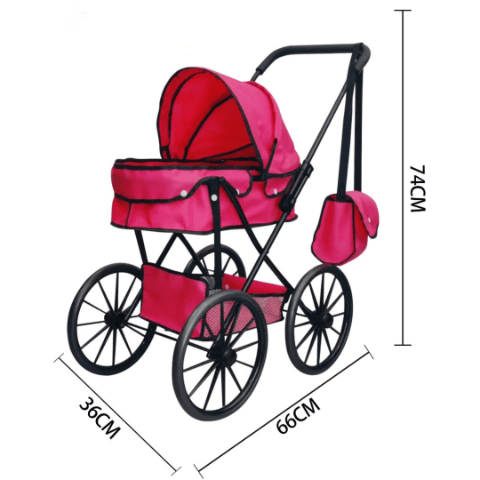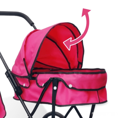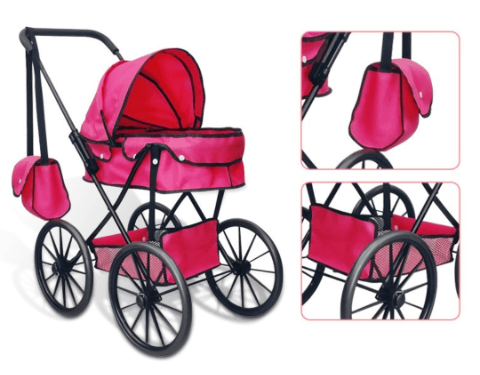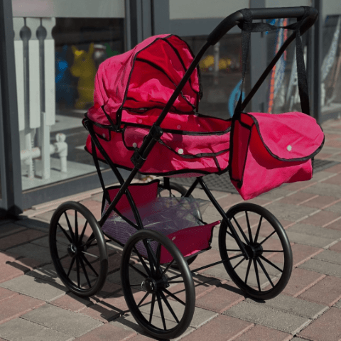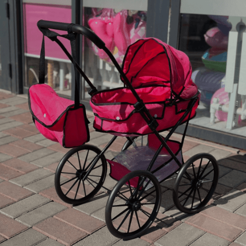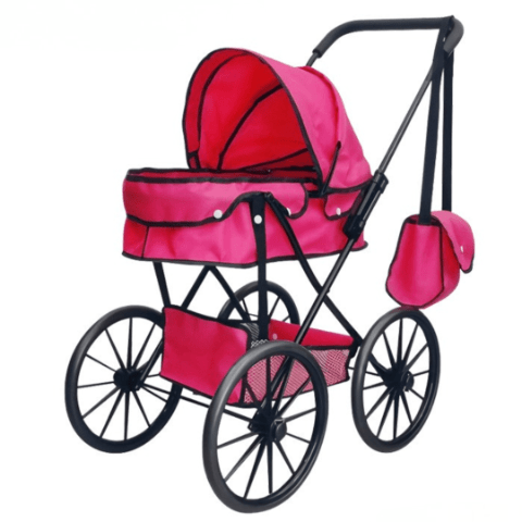 Căruciorul roz cu design elegant și roți mari transformă joaca cu păpuși într-o experiență realistă și plină de farmec.