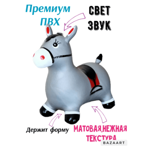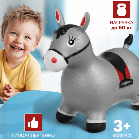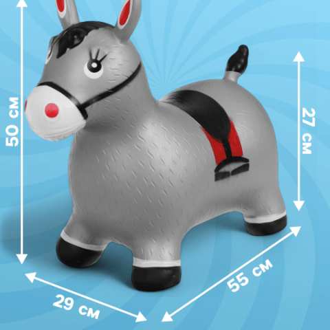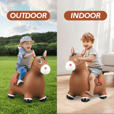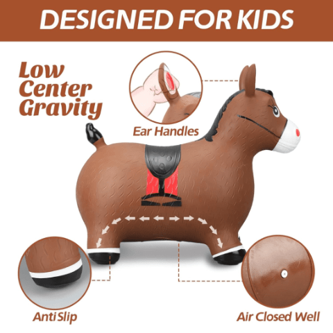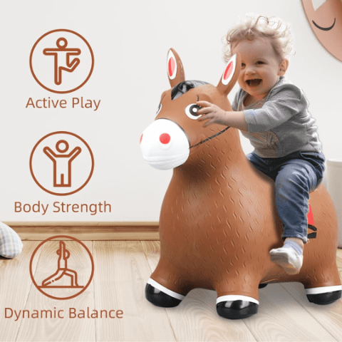 Copilul descoperă bucuria mișcării în timp ce sare pe măgărușul gonflabil, dezvoltând echilibrul și forța fizică.
