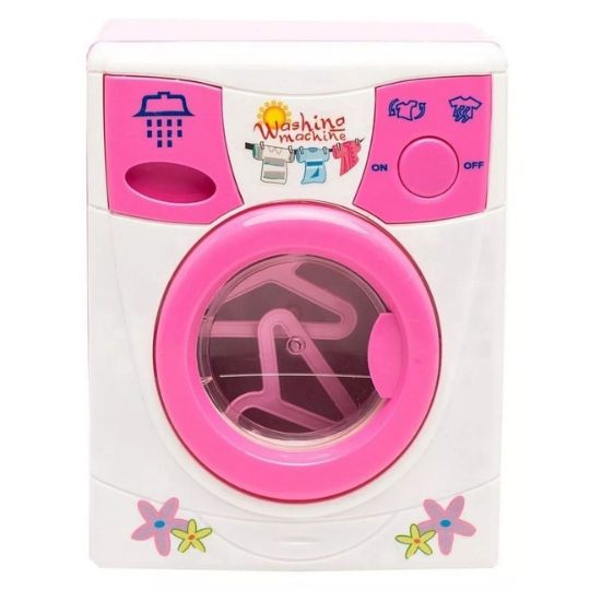 Această mașină de spălat jucărie este realizată într-un design atractiv, cu culori roz și detalii inspirate din electrocasnicele reale.