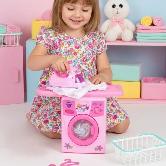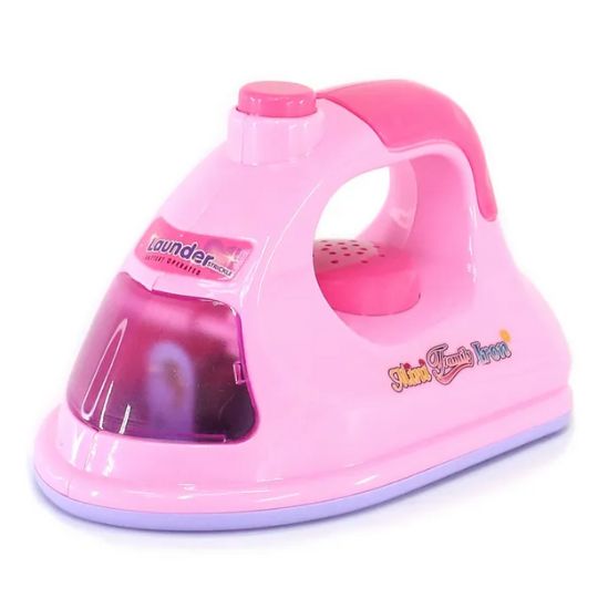 Setul include un fier de călcat jucărie, adaptat dimensiunilor copiilor, pentru simularea activităților casnice.