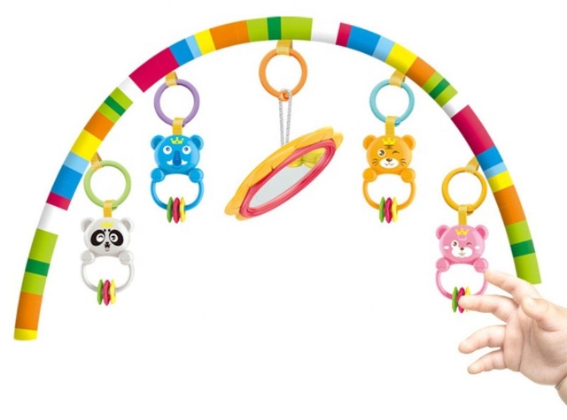 Arcada colorată cu jucării suspendate stimulează atenția vizuală și invită copilul să apuce, să lovească și să exploreze.