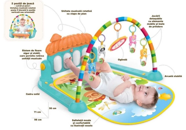 Pianul muzical reacționează la mișcările picioarelor și mâinilor, încurajând coordonarea și înțelegerea relației cauză–efect.
