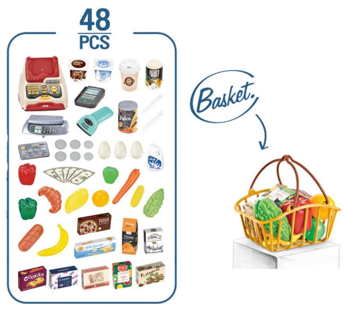 Cele 48 de accesorii colorate — alimente, bani, card, cântar și coș — creează o experiență completă de cumpărături care îi ține ocupați ore întregi.