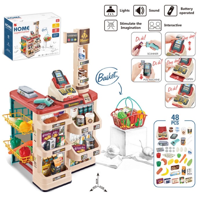 Transformă camera copilului într-un adevărat supermarket unde micii comercianți scanează produse, calculează și încasează ca în viața reală.