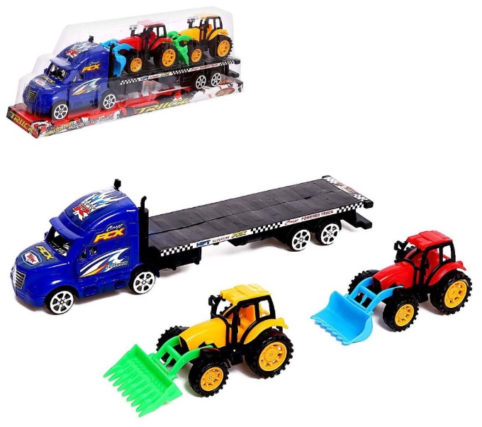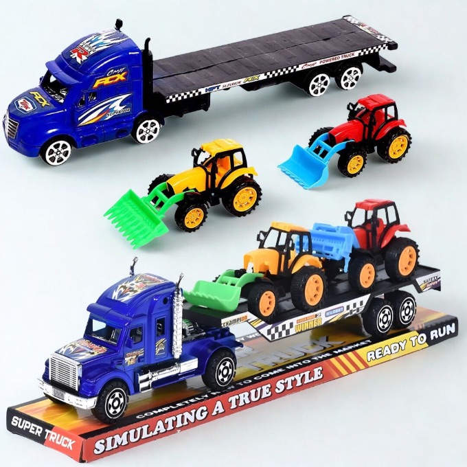 Camionul transportor cu platformă și 2 tractoare utilaje transformă joaca într-o misiune realistă de transport pentru micii pasionați de mașini mari.