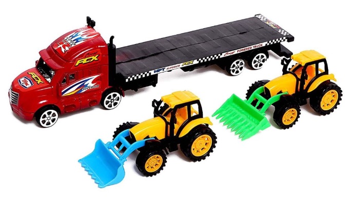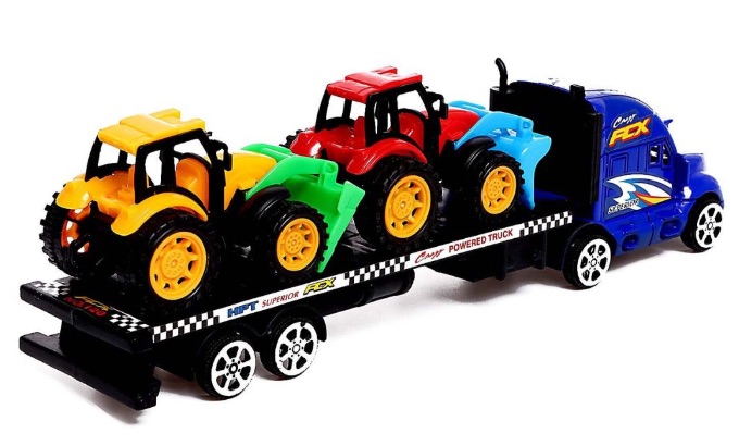 Copilul poate urca tractoarele pe platformă, le transportă și le descarcă pentru a crea scenarii de lucru la fermă sau pe șantier.
