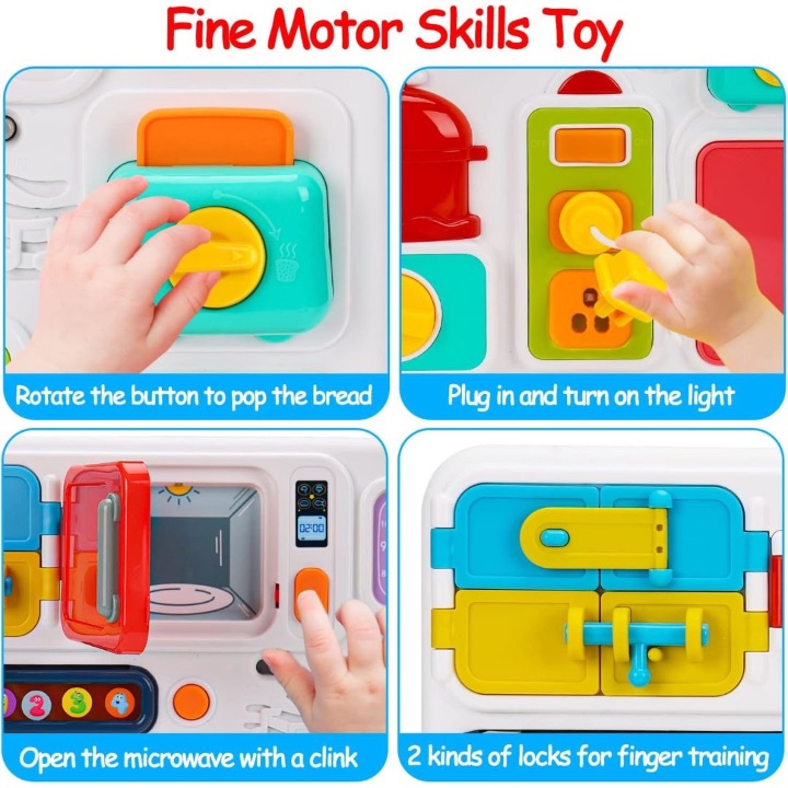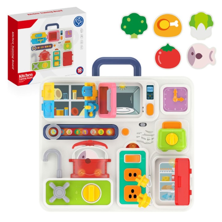 Acest busy board Montessori de bucătărie transformă curiozitatea copilului într-o joacă educativă plină de descoperiri, cu ușițe, butoane, încuietori, priză, ceas și elemente interactive inspirate din activitățile de zi cu zi.